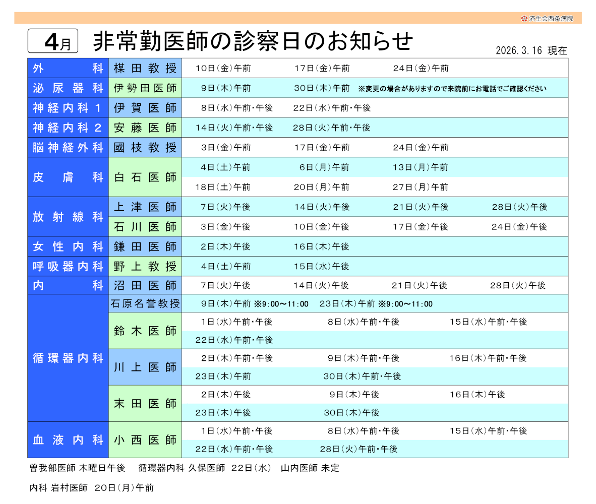 - このページに掲載されている休診・代診の予定は、都合により変更になる場合があります。