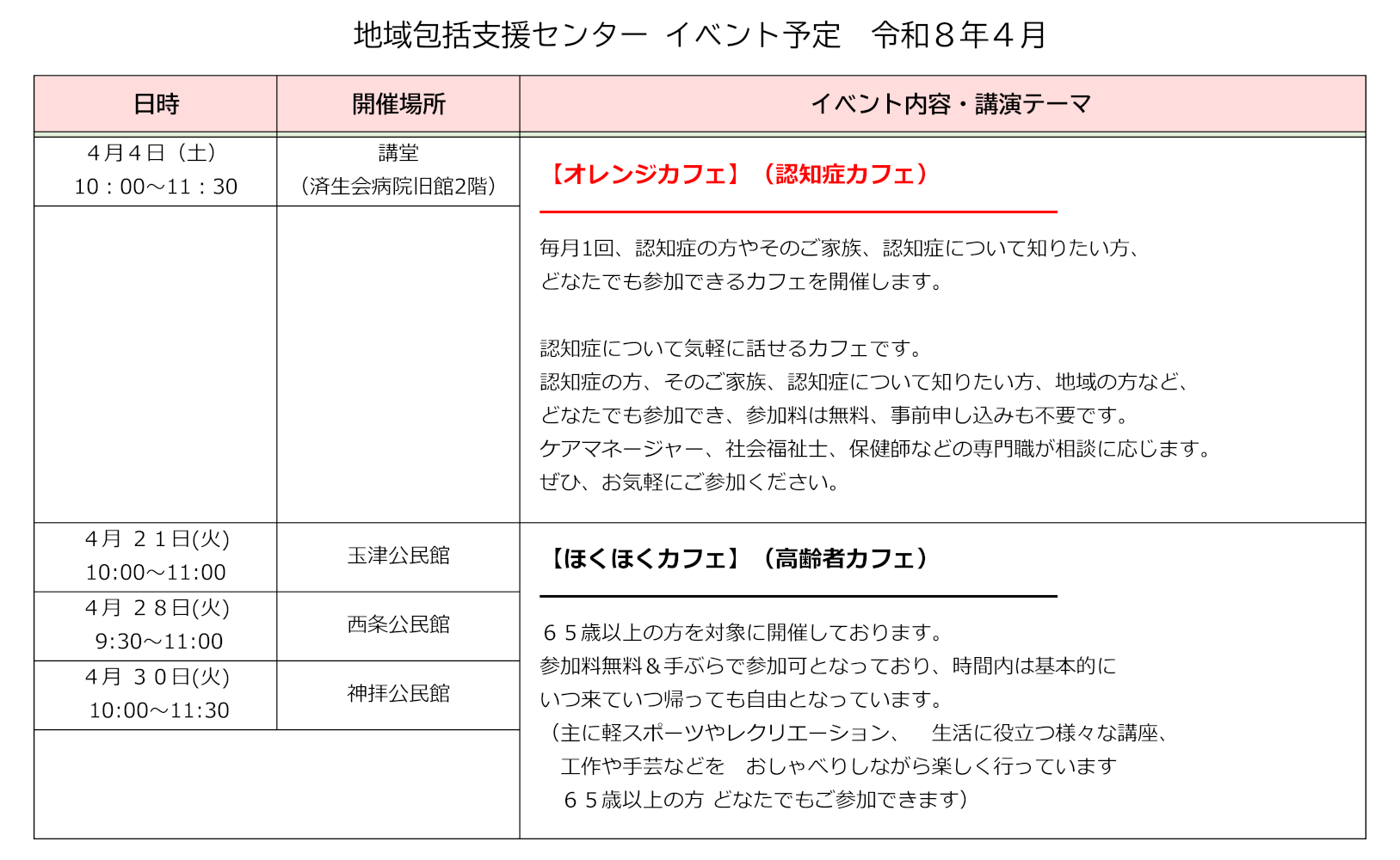 地域包括支援センター 令和8年4月イベント予定